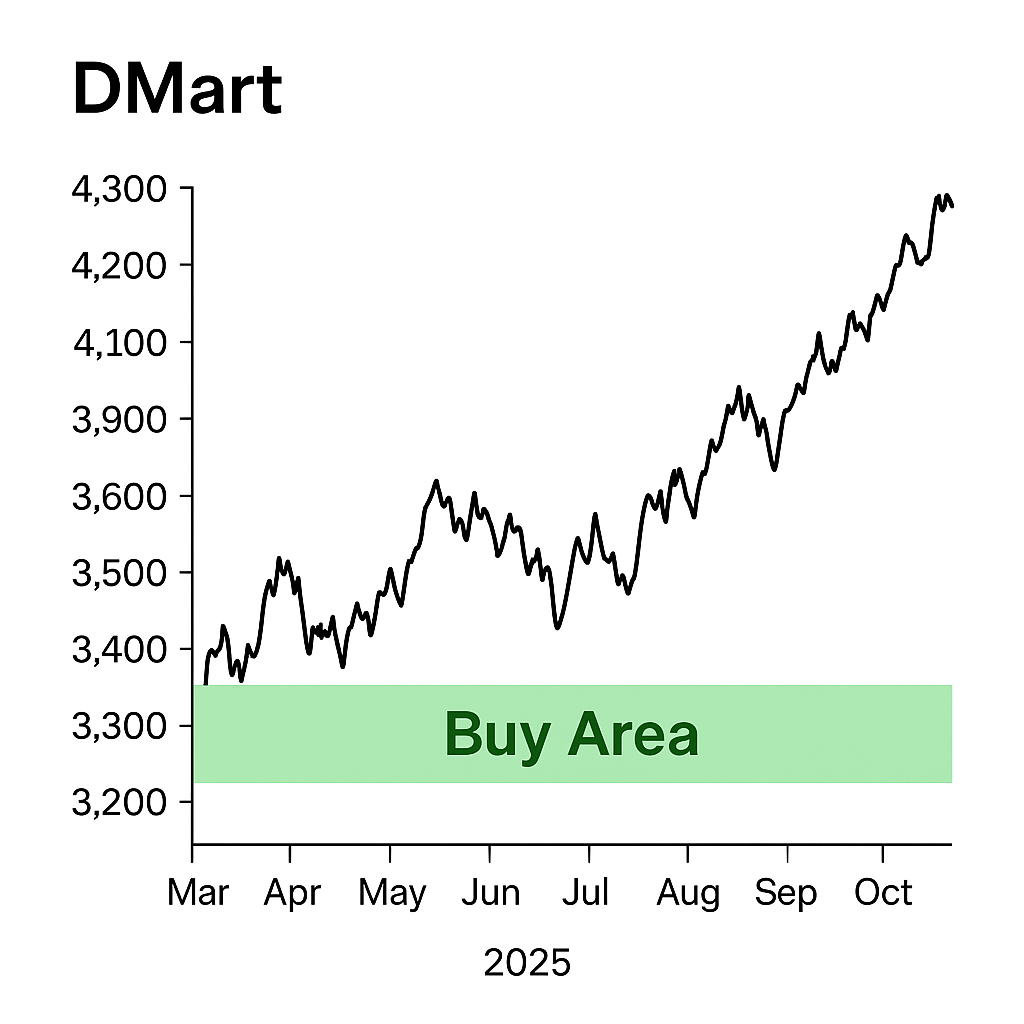 As of October 17, 2025, Avenue Supermarts (DMart) is trading around ₹4,302.50 per share. Back in March 2025, the stock was moving in the range of ₹3,300–₹3,600, which I personally consider a great buying zone for long-term investors.